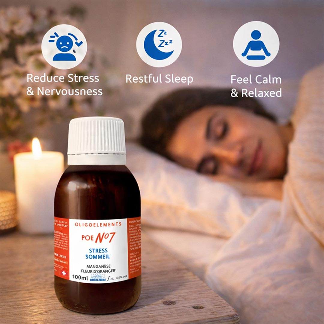 POE n.º 7 es una preparación de oligoelementos cuidadosamente formulada, diseñada para apoyar el sistema nervioso durante periodos de estrés, tensión nerviosa e inquietud. Combina oligoelementos ionizados con azahar, utilizado tradicionalmente por sus efectos calmantes y relajantes.